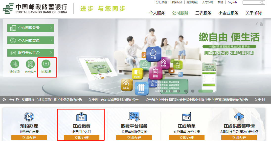 繳費用戶登錄“中國郵政儲蓄銀行”官網(wǎng)(http://www.psbc.com/cn/),點擊“服務快捷通道-在線繳費”進入,無需注冊及登錄。