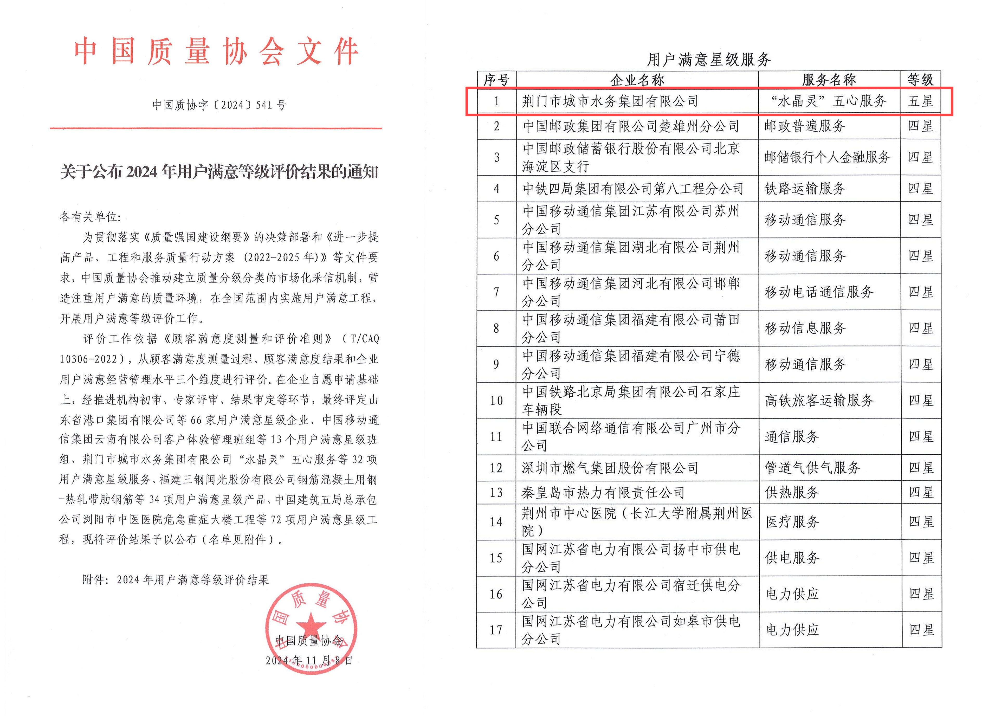11月8日,中國(guó)質(zhì)量協(xié)會(huì)公布2024年用戶滿意等級(jí)評(píng)價(jià)結(jié)果,荊門市城市水務(wù)集團(tuán)有限公司(以下簡(jiǎn)稱“集團(tuán)”)以“水晶靈”五心服務(wù)模式為特色,成為全國(guó)唯一一家獲評(píng)服務(wù)類五星的企業(yè),標(biāo)志著在供水服務(wù)領(lǐng)域已經(jīng)成為全國(guó)標(biāo)桿。