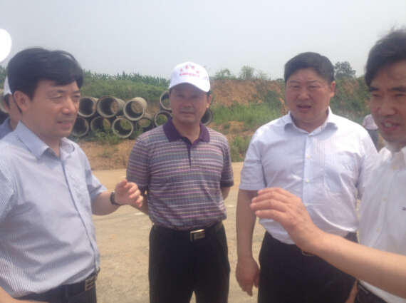 總經(jīng)理陳衛(wèi)國(中)和屈家?guī)X管理區(qū)工委書記湯旺林(右二)、工委主任鄭斌(左一)、市水務局局長曾云(右一)商談施工事宜。