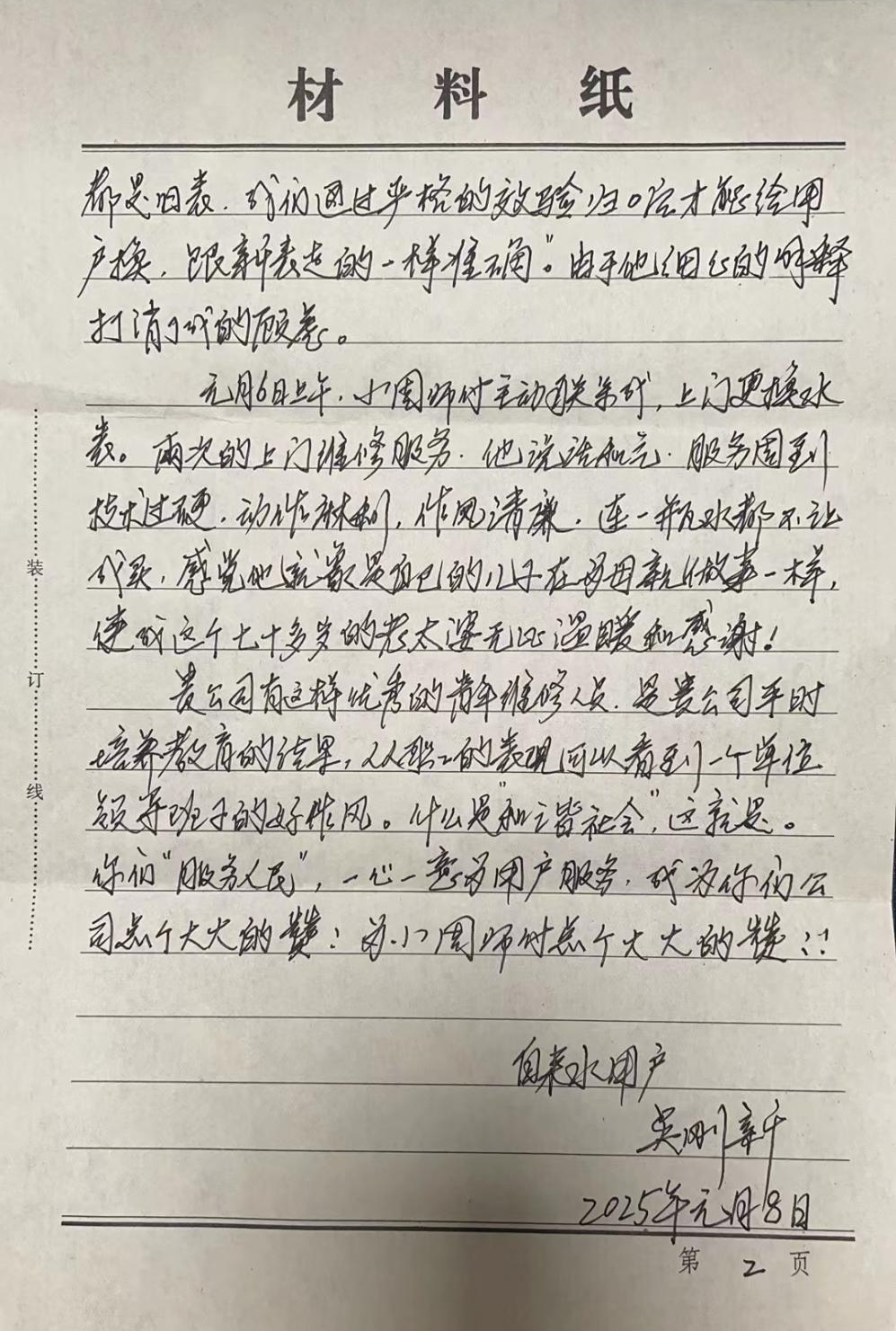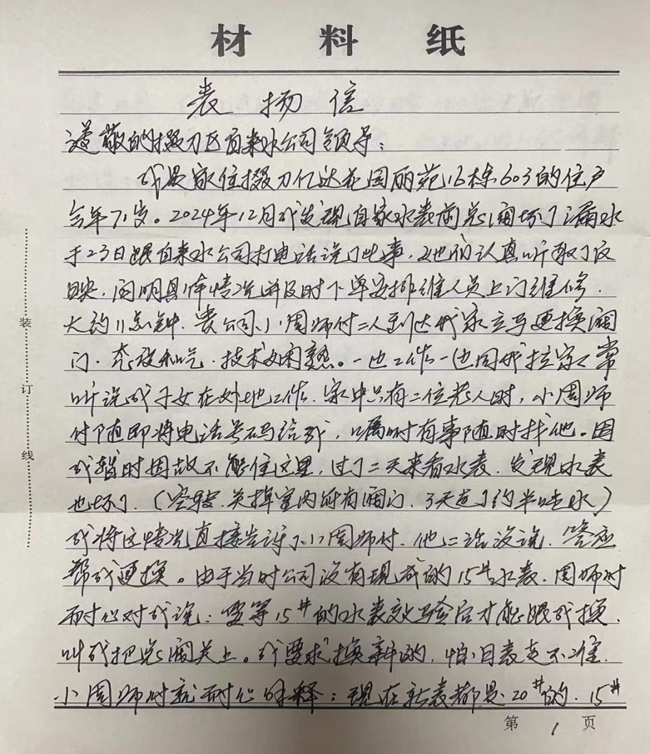 在表?yè)P(yáng)信中,老人深情表達(dá):“家中只有我們兩位老人,水務(wù)集團(tuán)的維修人員就像我們的兒子一樣,他說(shuō)話(huà)和氣,服務(wù)周到,技術(shù)過(guò)硬,動(dòng)作麻利,作風(fēng)清廉,讓我們感到無(wú)比溫暖。”