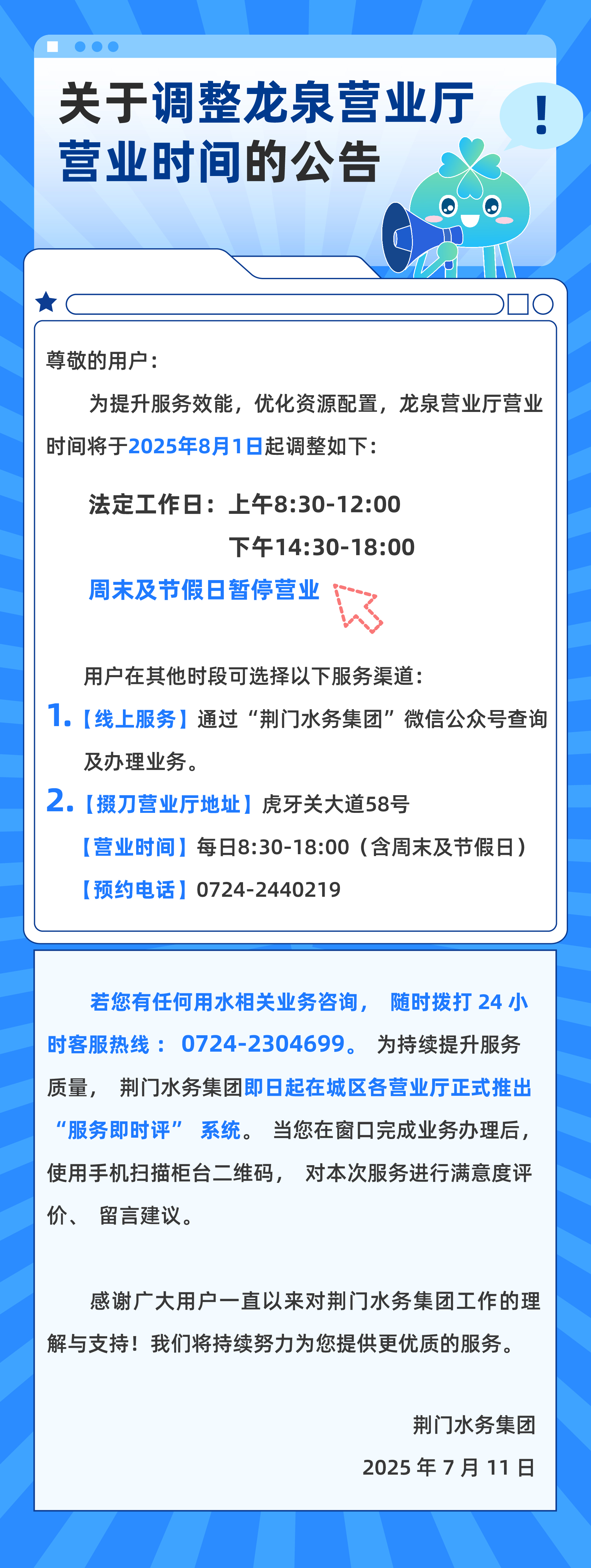 關(guān)于調(diào)整龍泉營(yíng)業(yè)廳營(yíng)業(yè)時(shí)間的公告